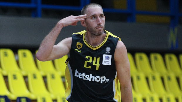 Ο Ματ Λοτζέσκι πανηγυρίζει το τρίποντο που σημείωσε σε αγώνα με το Περιστέρι