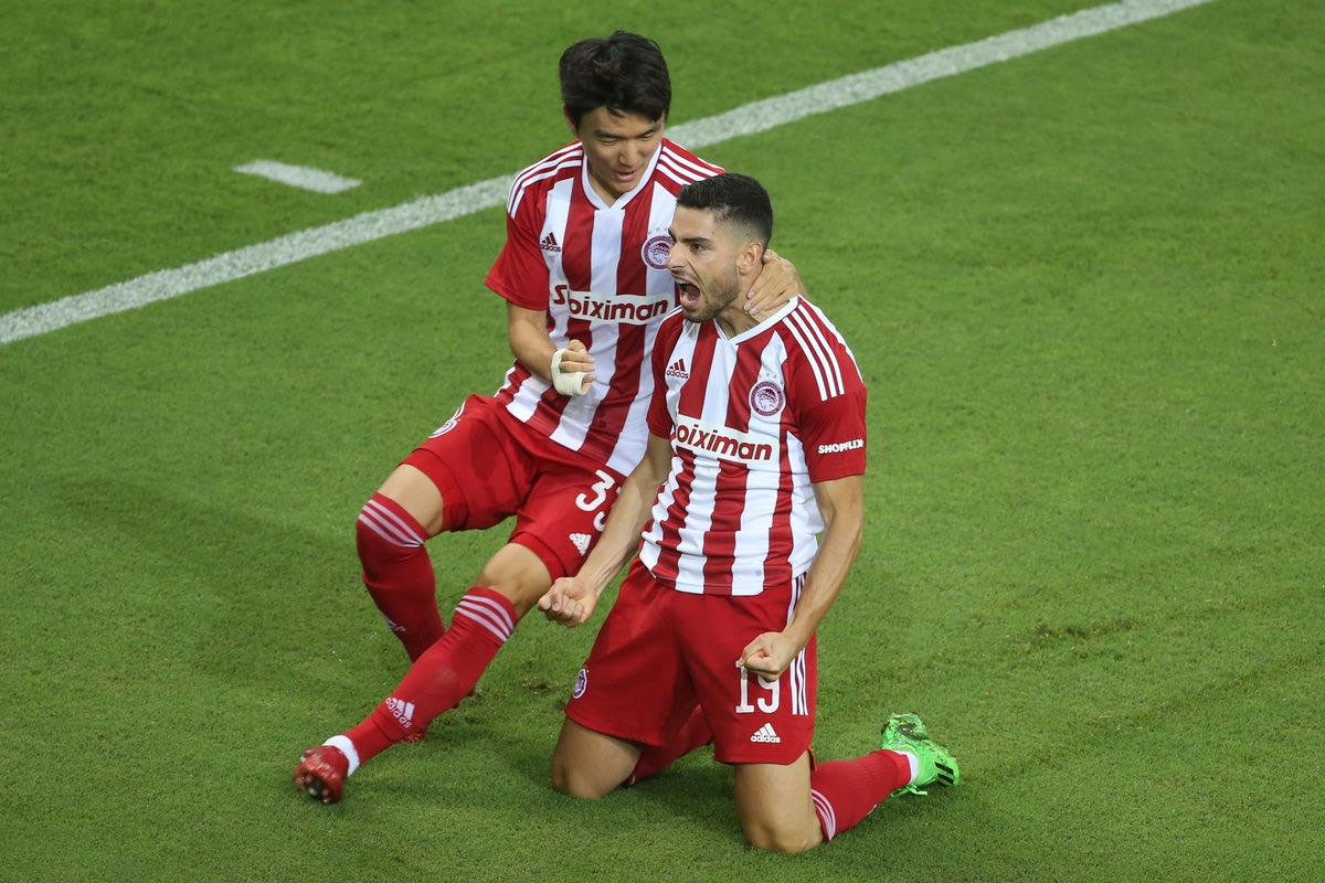 Ο Γιώργος Μασούρας πανηγυρίζει με τον Χουάνγκ το γκολ που πέτυχε στη ρεβάνς του Ολυμπιακού με τον Απόλλωνα Λεμεσού