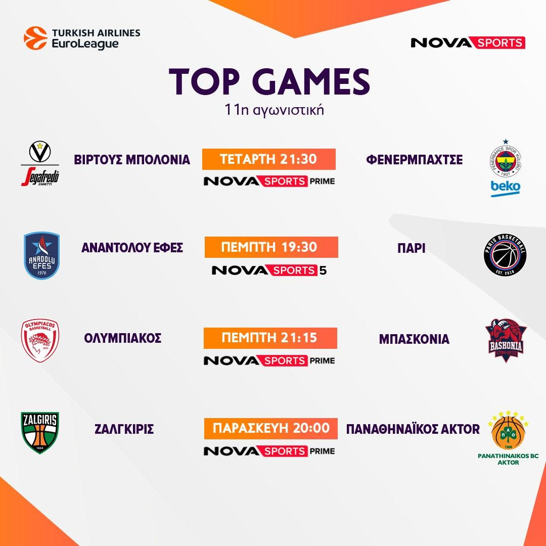 - 21:30 EuroLeague – 11η αγωνιστική: Βίρτους Μπολόνια-Φενερμπαχτσέ Novasports Prime σε περιγραφή του Γρηγόρη Παπαβασιλείου