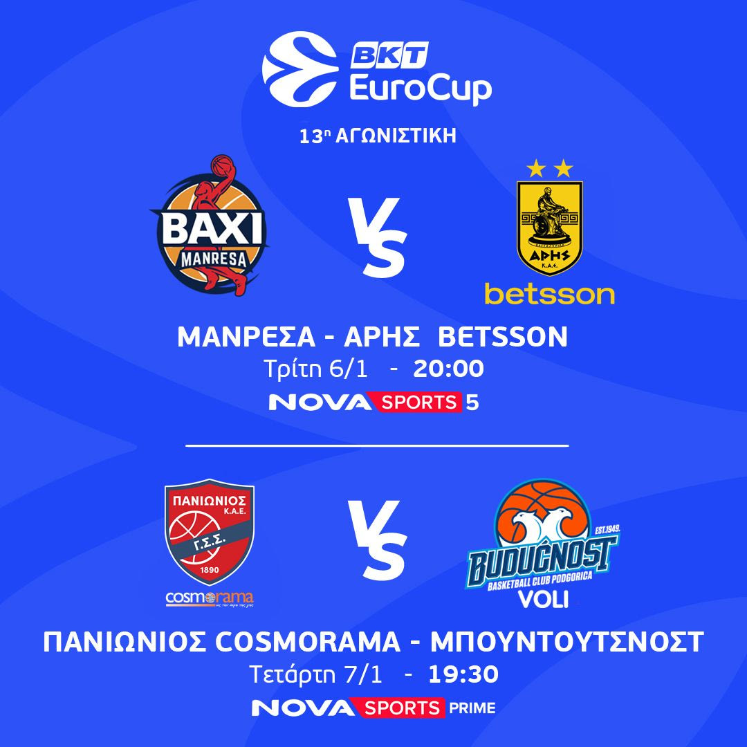 Το EuroCup συνεχίζεται με την 13η αγωνιστική οι συνδρομητές θα απολαύσουν τις αναμετρήσεις των δύο ελληνικών ομάδων, Μανρέσα-Άρης Betsson (6/1, 20:00) και Πανιώνιος Cosmorama Travel-Μπουντούτσνοστ (7/1, 19:30).