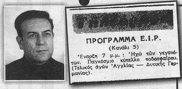 Η ελληνική τηλεόραση έκανε δειλά δειλά τα πρώτα της βήματα στα 60s. Το Μουντιάλ του ’66 της Αγγλίας μετέδωσε ο Γιάννης Διακογιάννης το στούντιο με σημαντική καθυστέρηση εν συγκρίσει με την ώρα έναρξης, όπως ύστερα από ώρες είδαν οι Ελληνες τηλεθεατές τον τελικό του Πρωταθλητριών (Μίλαν-Αγιαξ 4-1) της ίδιας χρονιάς.