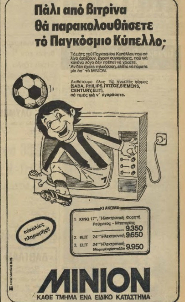 Εκτοτε, γύρω από το αθλητικό πρόγραμμα της ΕΙΡ και της ΥΕΝΕΔ τότε, στήθηκε μια ολόκληρη βιομηχανία. Οι μεγαλύτερες εταιρίες ηλεκτρονικών ειδών διαφήμιζαν τις τηλεοράσεις τους έχοντας ως «κράχτη» το Μουντιάλ κι καλούσαν τον κόσμο να αγοράσει μια τηλεόραση και να μη στηθεί στη βιτρίνα για να δει τον αγώνα!