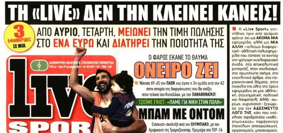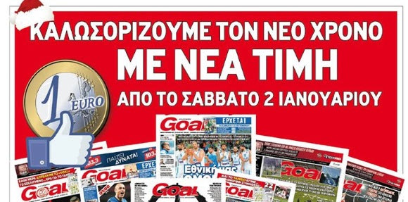 Για να αντιμετωπιστεί η κρίση, όπως αναφέραμε και από χθες , από το Σάββατο 2 Ιανουαρίου κατεβάζει και η “Goal News” στο 1 ευρώ. Κάτι το οποίο δεν άφησε… αναπάντητο η “Live Sport” η οποία πωλούνται στο 1,40 ευρώ και, προλαβαίνοντας τις εν λόγω εξελίξεις, γνωστοποίησε στο σημερινό της πρωτοσέλιδο ότι από αύριο κιόλας κατεβαίνει στο 1 ευρώ!