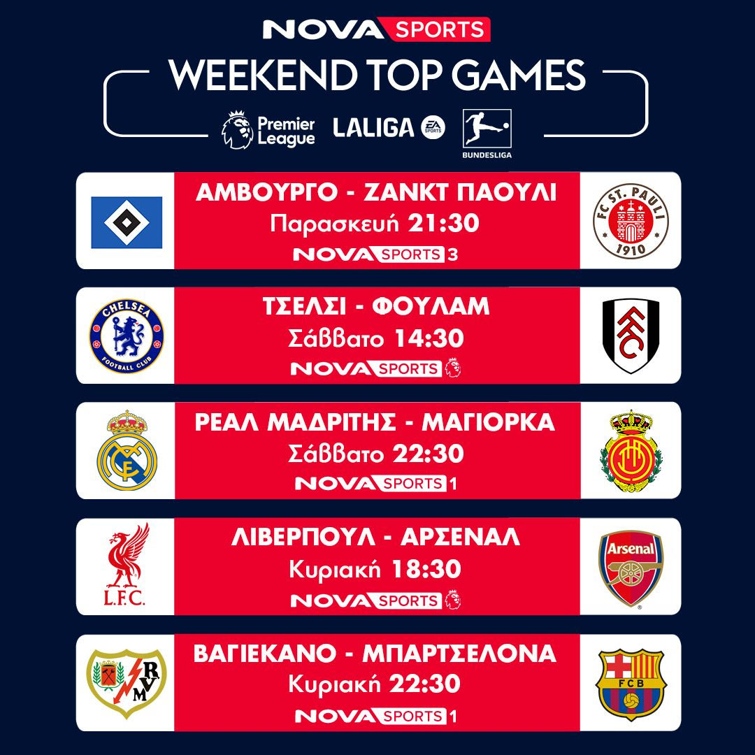 Καθηλωτική δράση με όλη τη Stoiximan Super League, Premier League, LaLiga, Bundesliga, Serie A, ντέρμπι Λίβερπουλ – Άρσεναλ, Ρέιντζερς – Σέλτικ, Σπόρτινγκ – Πόρτο και διοργανώσεις UEFA στα κανάλια Novasports και Cosmote Sport.