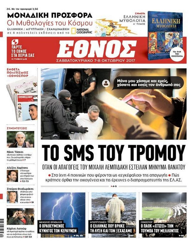 Διαβάστε στο Έθνος που κυκλοφορεί αυτό το Σαββατοκύριακο στα περίπτερα. Η απαγωγή Λεμπιδάκη, συνέντευξη του Νίκου Τόσκα αλλά και ο πρώτος τόμος της ελληνικής μυθολογίας, από τη σειρά "Μυθολογίες του Κόσμου" του National Geographic