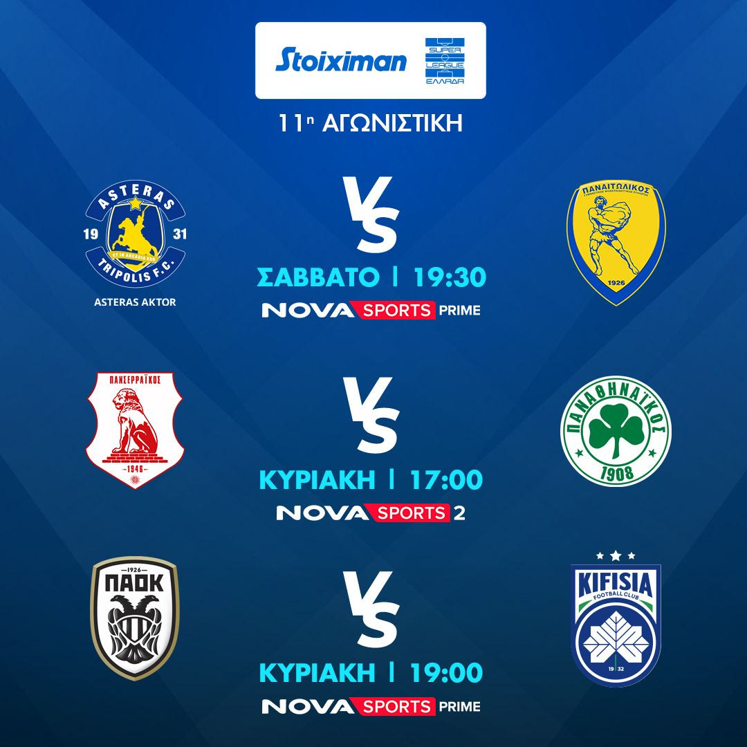 Η 11η αγωνιστική Stoiximan Super League περιλαμβάνει τους αγώνες Asteras Aktor – Παναιτωλικός, Πανσερραϊκός – Παναθηναϊκός, ΠΑΟΚ – Κηφισιά (διαθέσιμοι από τα κανάλια Novasports) και Ολυμπιακός – Ατρόμητος, ΑΕΚ – Άρης, Βόλος ΝΠΣ – Λεβαδειακός, ΑΕΛ Novibet – ΟΦΗ (διαθέσιμοι από τα κανάλια Cosmote Sport).