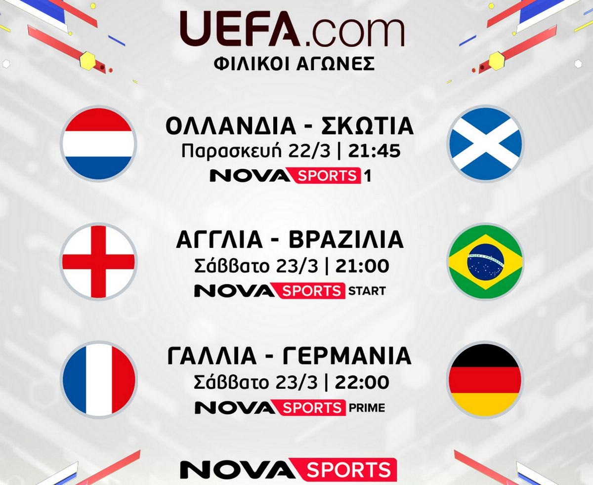 Την ίδια χρονική περίοδο διεξάγονται και σημαντικά φιλικά παιχνίδια με τους συνδρομητές του Novasports να απολαμβάνουν Ολλανδία – Σκωτία (22/3, 21:45), Κύπρος-Σερβία (25/3, 19:00), Γερμανία-Ολλανδία (26/3, 21:45), Αγγλία – Βέλγιο (26/3, 21:45), Γαλλία-Χιλή (26/3, 22:00), Ισπανία-Βραζιλία (26/3, 22:30).