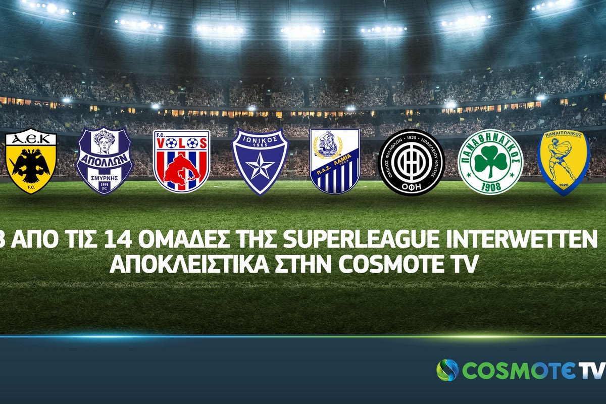 Η νέα σεζόν της Superleague Interwetten ξεκινάει και για πρώτη φορά 8 ελληνικές ομάδες θα παίζουν αποκλειστικά στο «γήπεδο» της COSMOTE TV. Μετά τον Παναθηναϊκό, την ΑΕΚ και τον ΟΦΗ, τα κανάλια COSMOTE SPORT θα μεταδίδουν όλους τους εντός έδρας αγώνες για το Πρωτάθλημα της Superleague Interwetten, τους εντός και εκτός έδρας φιλικούς αγώνες, καθώς και επιλεγμένους αγώνες των Πρωταθλημάτων Υποδομής και των ομάδων του Απόλλωνα Σμύρνης, του Βόλου, του Ιωνικού, της Λαμίας και του Παναιτωλικού. Μέσα από τις συμφωνίες αυτές, περίπου το 60% των αγώνων του ελληνικού πρωταθλήματος ποδοσφαίρου θα μεταδίδεται για τα επόμενα 2 χρόνια αποκλειστικά από την COSMOTE TV.