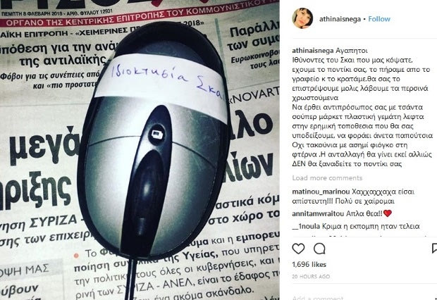Η Νέγκα πάντως δεν το… άφησε έτσι. Γνωστή για το καυστικό της χιούμορ, θέλησε να… θυμίσει στο κανάλι ότι υπάρχουν δεδουλευμένα που πρέπει να καταβληθούν. Και σε ανάρτησή της στο Instagram παρουσίασε ένα… ποντίκι υπολογιστή ως “ιδιοκτησία ΣΚΑΪ” και έγραψε: