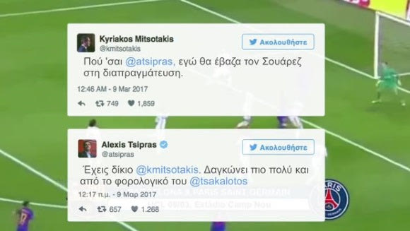 Λίγες ημέρες μετά την… κόντρα στο twitter μεταξύ Αλέξη Τσίπρα και Κυριάκου Μητσοτάκη με αφορμή το Παρί Σεν Ζερμέν-Μπαρτσελόνα, η Κομμουνιστική Νεολαία Ελλάδα τρόλαρε τους δύο πολιτικούς αρχηγούς με ένα φοβερό video. Με ατάκες όπως το «η Αχτσιόγλου παίζει μεγάλη μπάλα στην Ευρώπη»! Επικό…