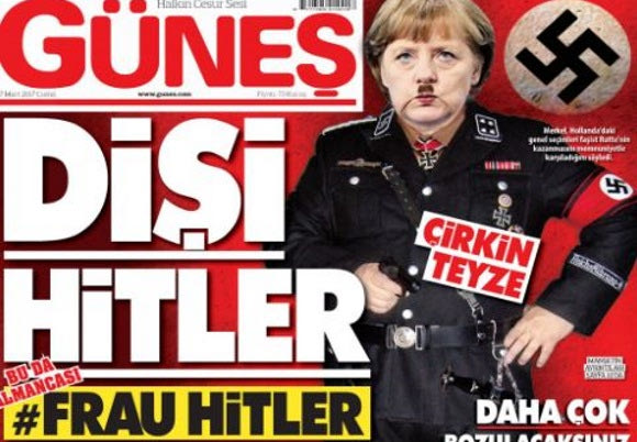Η Aνγκελα Μέρκελ εμφανίστηκε, σε πρωτοσέλιδο, όπως την έχουμε φαντασιωθεί: με μουστάκι και στολή ναζί. Η τουρκική φιλοκυβερνητική εφημερίδα «Gunes» το δημοσίευσε με τίτλο #FrauHitler αλλά και με τη σημείωση «η άσχημη Θεία» στο εν λόγω φωτομοντάζ. ΟΚ, η «Gunes» είναι κάτι μεταξύ «Κόντρα» και «Ελεύθερης Ωρας», μεταξύ μας… Ωστόσο η Αγγέλω κάπως έτσι πορεύεται εδώ και χρόνια.