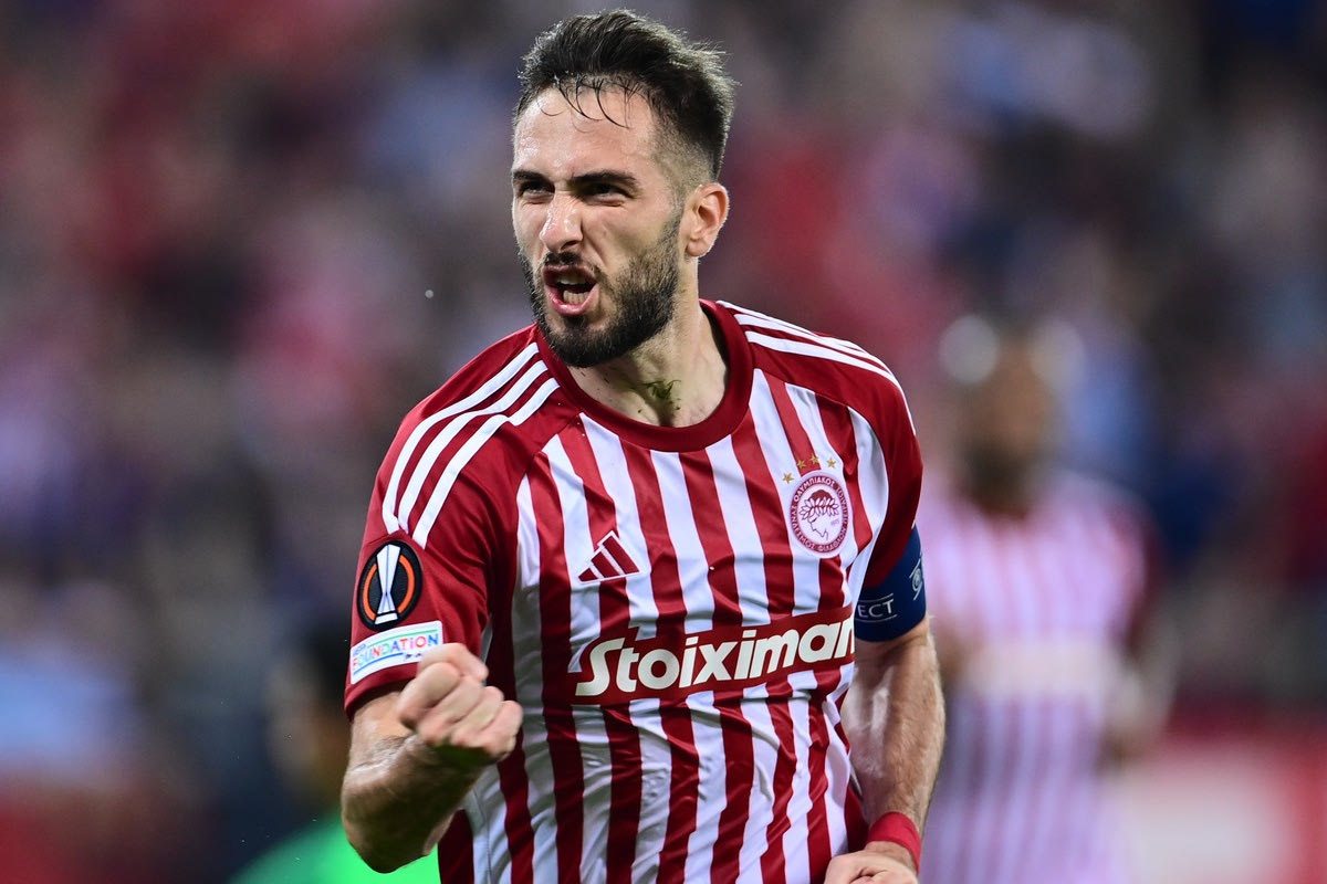 Ο Κώστας Φορτούνης πανηγυρίζει γκολ του στο Ολυμπιακός - Γουέστ Χαμ Eurokinissi Sports