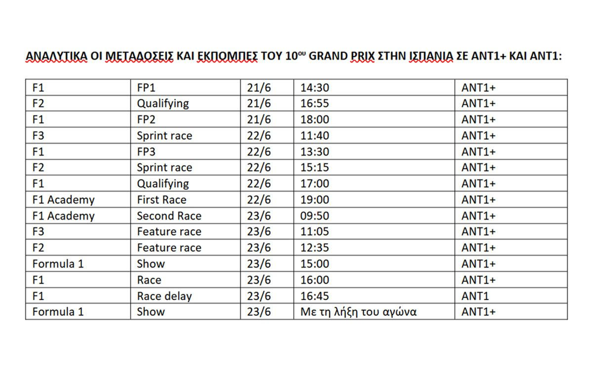 Αναλυτικά οι μεταδόσεις και εκπομπές του 10ου Grand Prix στην Ισπανία σε ΑΝΤ1+ και ΑΝΤ1: