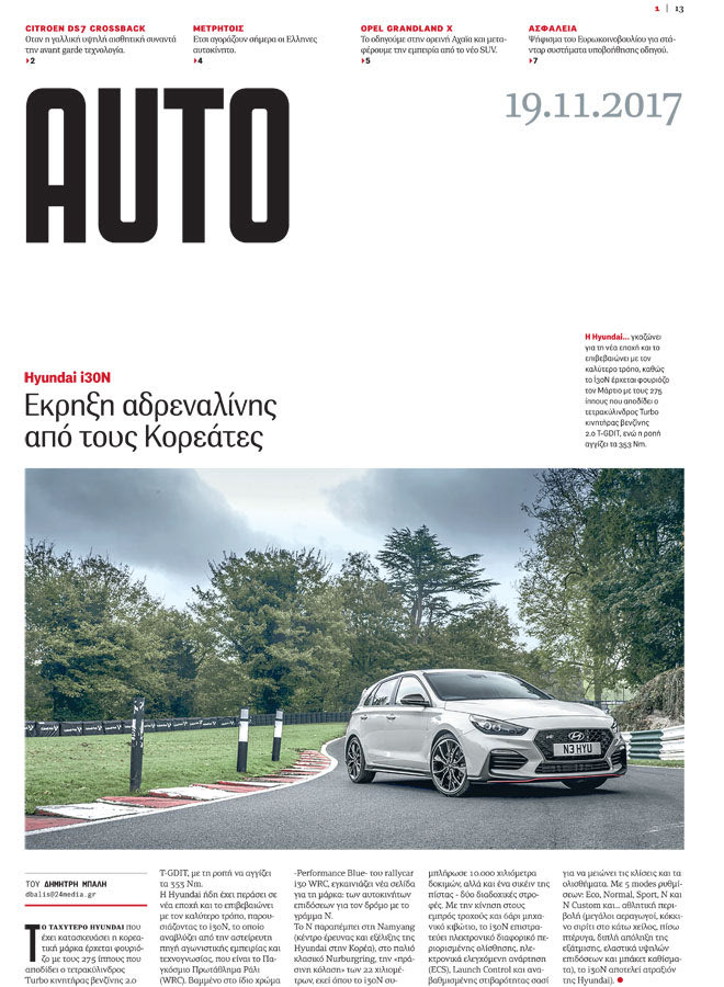 Τσίτα τα γκάζια και αυτή την Κυριακή με την έκρηξη αδρεναλίνης από τους Κορεάτες χάρη στο Hyundai i30 αλλά και την γαλλική υψηλή αισθητική που συναντά την avant garde τεχνολογία στο Citroen DS7 Crossback. Ακόμα: Οδηγούμε το Οpel GrandLAND στην ορεινή Αχαΐα και παρουσιάζουμε το πώς αγοράζουν οι Έλληνες αυτοκίνητα .
