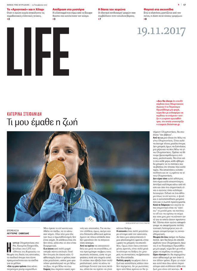 Το ειδικό ένθετο για τον σύγχρονο τρόπο ζωής φιλοξενεί την κορυφαία αθλήτρια επί κοντώ στον κόσμο, την Ολυμπιονίκη Κατερίνα Στεφανίδη η οποία αποκαλύπτει τι της έμαθε η ζωή. Μαζί η ελληνική φρενίτιδα γύρω από τα escape rooms αλλά και η δίαιτα του χειμώνα.