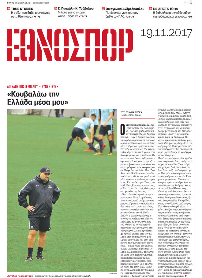 Ποιος είπε ότι δεν θα υπάρχει Έλληνας στο Μουντιάλ της Ρωσίας; Ο προπονητής της Αυστραλίας, Άγγελος Ποστέκογλου, μιλάει στο ΕΘΝΟΣΠΟΡ αυτής της Κυριακής, το οποίο μεταξύ άλλων παρουσιάζει το ντέρμπι Παναθηναϊκός-ΑΕΚ μέσα από τις γυναικείες ματιές της “πράσινη” Σόφης Πασχάλης και της “ενωσίτισσας” Κατερίνας Τσάβαλου.