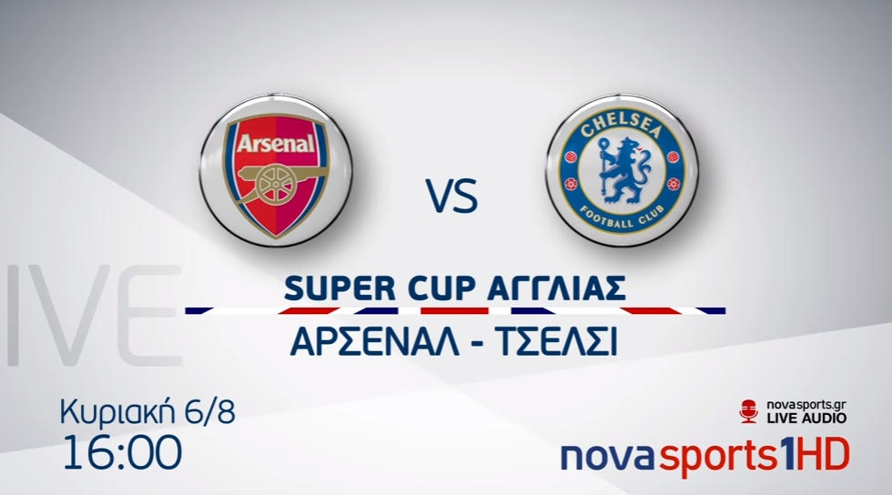 Για το Super Cup Αγγλίας, την Κυριακή 6 Αυγούστου στις 16:00 η πρωταθλήτρια Τσέλσι θα αντιμετωπίσει στο «Γουέμπλεϊ» του Λονδίνου, την Κυπελλούχο Άρσεναλ σε μία άτυπη επανάληψη του τελικού του Κυπέλλου Αγγλίας FA Cup, όταν και οι «κανονιέρηδες» είχαν κατακτήσει το τρόπαιο. Ο αγώνας θα μεταδοθεί από το Novasports1HD σε περιγραφή του Άγγελου Στυλιάδη.