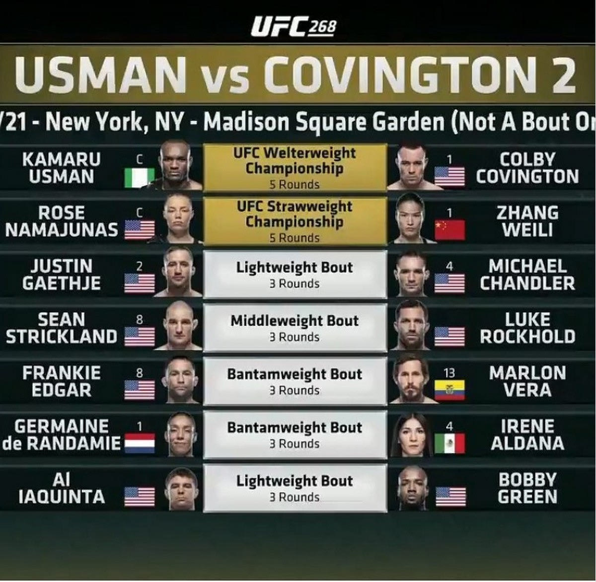 Ιδιαίτερα ματσαρισματα που τραβούν το ενδιαφέρον παρουσιάζει η νέα κάρτα στο UFC 268 που ετοιμάζει ο Dana White με αφορμή το event της 6ης Νοεμβρίου στην Νέα Υόρκη.