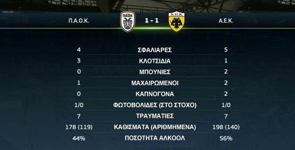 Το ημίχρονο ολοκληρώθηκε με το σκορ στο 1-1, με τον ΠΑΟΚ, όπως θα διαπιστώσετε και στον παρακάτω πίνακα, να έχει μία τελική περισσότερη από την αντίπαλό του (7 έναντι 6). Μετά από ένα γεμάτο ένταση και πάθος πρώτο ημίχρονο, από το οποίο δεν έλειψαν τα σκληρά μαρκαρίσματα, οι “παίκτες” των δύο ομάδων είχαν την ευκαιρία να πάρουν ανάσες. Στην επανάληψη έπρεπε να αντιμετωπίσουν αυτό: Ούτε ο ΠΑΟΚ ούτε η ΑΕΚ μπόρεσαν να κάνουν “παιχνίδι” απέναντι σε οργανωμένη άμυνα, αμφότεροι πόνταραν στις αντεπιθέσεις, ενώ Κ.Γ. και Θ.Ρ. ήταν απελπιστικά μόνοι.