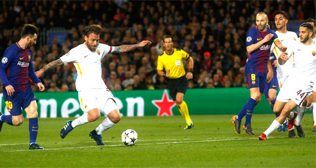 Λίγα λεπτά αργότερα, το σουτ του Ράκιτιτς από τα πλάγια, βρήκε στο κάθετο δοκάρι του Άλισον, ο οποίος φρόντισε να δείξει τις ικανότητές του, σταματώντας τις προσπάθειες των Μέσι και Σουάρες. Το σκορ άνοιξε στο 38′, όταν ο αρκετά κεφάτος Ινιέστα έπαιξε το ένα-δύο με τον Μέσι, αμφότεροι μπήκαν στην περιοχή και όταν ο Αντρεσίτο προσπάθησε να την ξαναδώσει στον Αργεντινό, παρενεβλήθη ο Ντε Ρόσι, πλάσαρε άθελά του με άψογο τρόπο τον Άλισον και έγραψε το 1-0. Η απάντηση για τους Ρωμαίους ήρθε δυο λεπτά αργότερα. Ο Πελεγκρίνι ανατράπηκε καθαρά από τον Ουμτιτί, στο όριο της μεγάλης περιοχής και ο διαιτητής αποφάσισε ότι η παράβαση είχε γίνει λίγα χιλιοστά εκτός γραμμής, δίνοντας φάουλ αντί για πέναλτι. Τα επαναλαμβανόμενα ριπλέι που είδαμε στη συνέχεια, δεν μας διαφώτισαν για το αν η Ρόμα θα έπρεπε να εκτελέσει από τα 16.5 μέτρα (όπως και έγινε) ή από τα έντεκα.