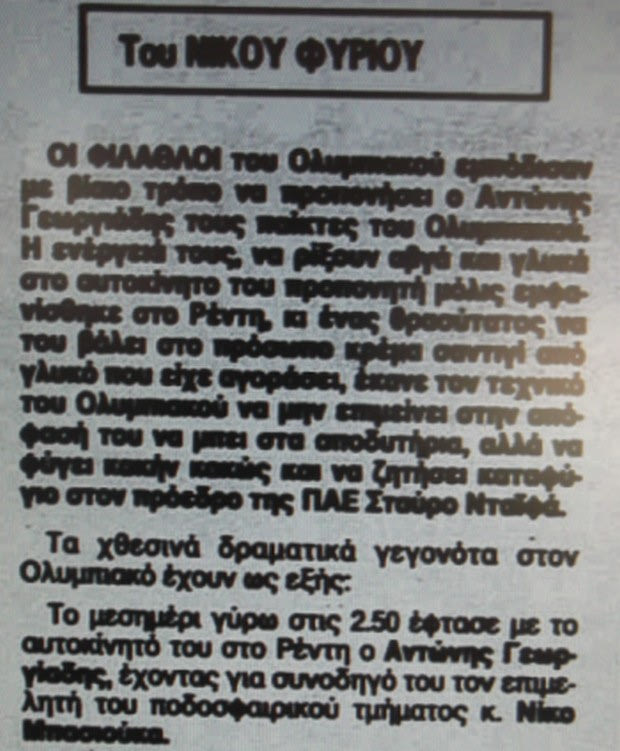 Εκείνο το κυριακάτικο απόγευμα, λοιπόν, ερρίφθη ο κύβος με αποτέλεσμα να απολυθεί ο Μπλαχίν και να προσληφθεί ο Γεωργιάδης, ο οποίος επρόκειτο να γνωρισθεί με τους παίκτες και να κάνει την πρώτη προπόνηση του την επόμενη μέρα του αγώνα Κυπέλλου…
