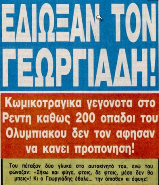 Ένας απ’ αυτούς τον βρήκε στο πρόσωπο, άλλος ένας προσγειώθηκε στο παρμπρίζ και με το που διαπίστωσε το έκρυθμον του πράγματος, ο Γεωργιάδης έκανε όπισθεν και έφυγε!