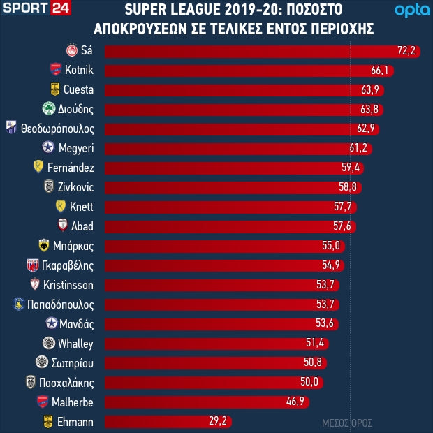 Η κάθετη μπλε διακεκομμένη γραμμή είναι ο μέσος όρος, ώστε με μια ματιά να βλέπετε ποιοι τον ξεπέρασαν και ποιοι ήταν κάτω από το μέτριο. Απόλυτος κυρίαρχος στην κορυφή ο Ζοσέ Σα, που έβγαλε το 82.4% των τελικών που πήγαν προς την εστία του Ολυμπιακού. Πίσω του ο Θεοδωρόπουλος της Λαμίας και ο Κότνικ του Πανιώνιου, που τα πήγαν καλά απέναντι σε μεγάλο όγκο τελικών.