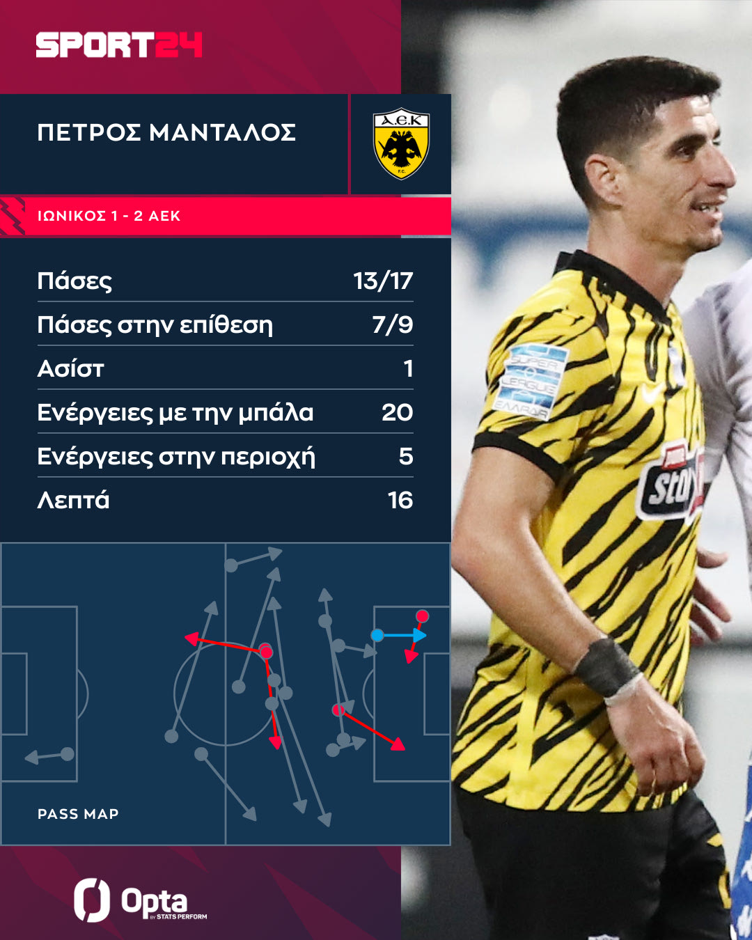 Γενικότερα, ολοκλήρωσε με 13/17 πάσες, εκ των οποίων 7/9 ήταν στην επίθεση. Όπως φαίνεται και στο γράφημα της Opta/Stats Perform, ο Μάνταλος κατέβαινε και χαμηλά στο γήπεδο προκειμένου να πάρει την μπάλα και να δημιουργήσει για την ομάδα του, συμβάλλοντας τα μέγιστα στην ανατροπή.