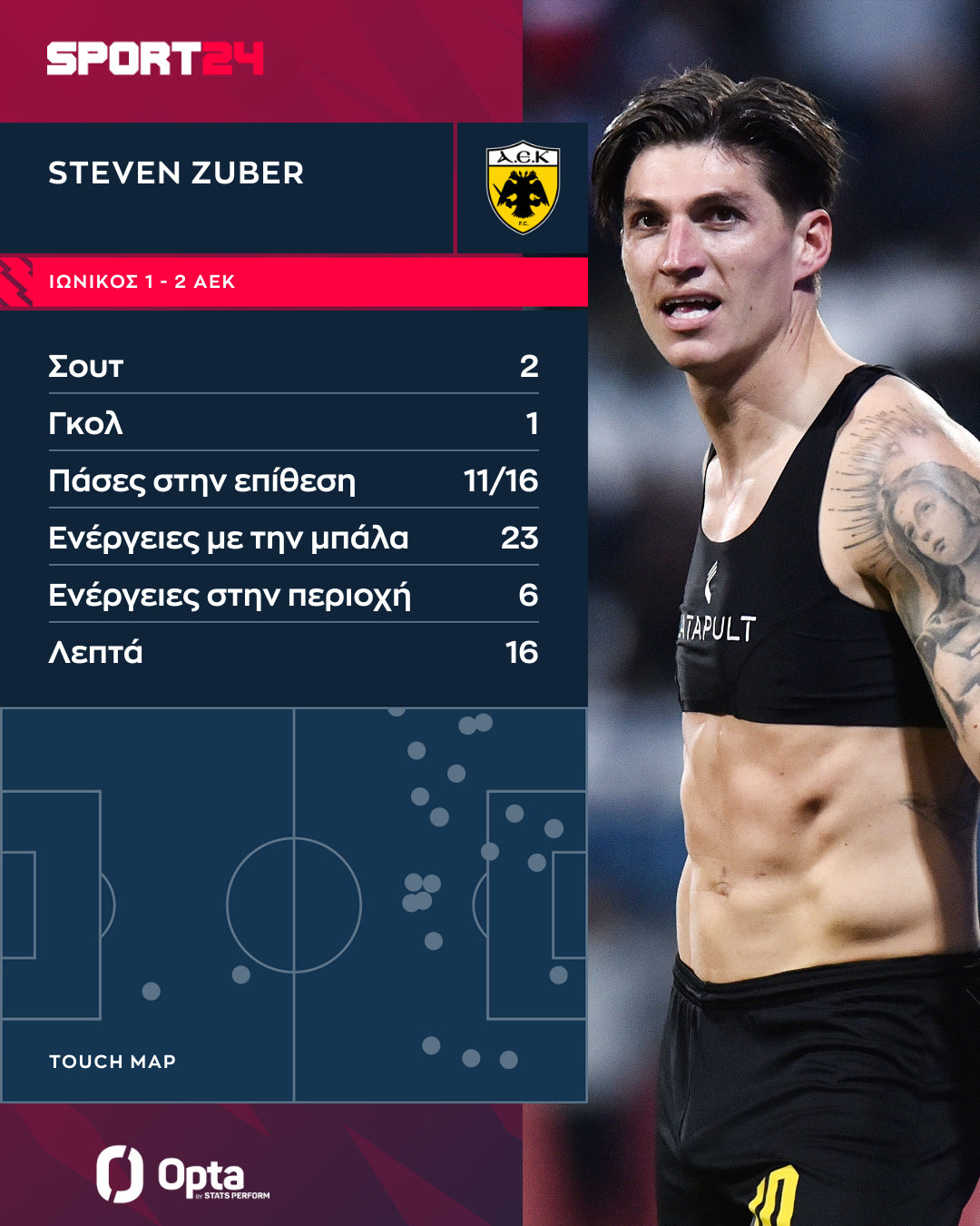Αντίθετα, στην αναμέτρηση με τον Ιωνικό ο Τσούμπερ λειτούργησε με έναν διαφορετικό τρόπο, αγωνιζόμενος λίγο πίσω από τον Σέρχιο Αραούχο. Μία θέση που φαίνεται πως του ταιριάζει περισσότερο στο σύστημα του Αλμέιδα, αφού δεν έχει τα αγωνιστικά χαρακτηριστικά για να υπηρετήσει ένα πιο physical game. Ο Ελβετός εξτρέμ πρόλαβε να έχει 23 ενέργειες με την μπάλα σε 16 λεπτά, εκ των οποίων οι έξι μέσα στη μεγάλη περιοχή. Παράλληλα, συνέλαβε και στην ανάπτυξη, έχοντας 11/16 πάσες στην επίθεση.