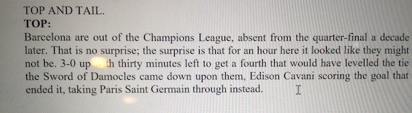 “Η Μπαρτσελόνα είναι εκτός οκτάδας μετά από μια δεκαετία αλλά η έκπληξη δεν είναι αυτό, η έκπληξη είναι πως για 60′ φαινόταν πως μπορεί να τα καταφέρουν”. Τα λόγια του, που αφορούν το “κανονικό” παιχνίδι μέχρι το 85’, είναι η κατάλληλη πάσα για να πάμε παρακάτω.
