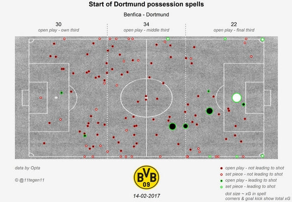 Μέχρι τότε, αξίζει να ρίξετε μια ματιά στο γράφημα που δείχνει το πόσο καλά πίεσε η Ντόρτμουντ ψηλά. Οι κύκλοι δείχνουν τα σημεία όπου ξεκίνησαν όλες οι κατοχές των Γερμανών και οι πράσινοι δείχνουν τις επιθέσεις που κατέληξαν σε σουτ.