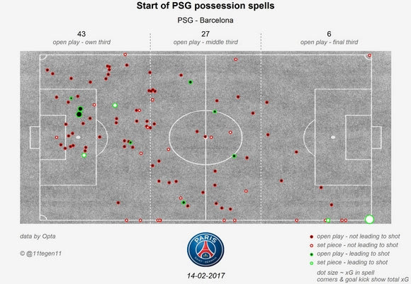 Η Παρί σήκωσε την περισσότερη σκόνη χάρις στη συντριβή της Μπαρτσελόνα. Απολύτως δίκαια, όχι μόνο για το σκορ, αλλά και για τη συνολική της εικόνα στο χορτάρι. Στο γράφημα φαίνεται πως η Παρί δεν βρήκε πράγματα απ’την πίεση ψηλά, αλλά διασχίζοντας σχεδόν όλο το γήπεδο: οι επιθέσεις ξεκινούσαν από χαμηλά και οι παίκτες του Έμερι έφταναν σε τελική και σε ευκαιρία χωρίς να τους σταματήσει κανείς.