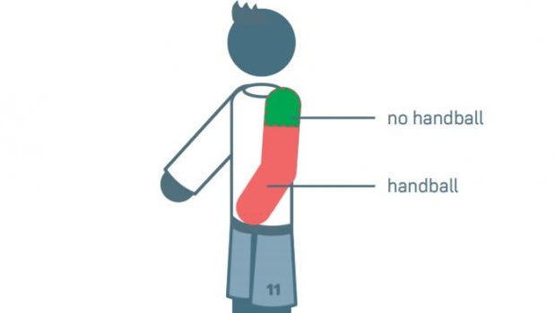 Το πράσινο κομμάτι του γραφήματος από φέτος δεν θεωρείται κομμάτι του χεριού. Οι αμυνόμενοι μπορούν να παίξουν με αυτό την μπάλα χωρίς να δοθεί πέναλτι και οι επιθετικοί μπορούν να σκοράρουν, χωρίς να ακυρωθεί το γκολ για χέρι.