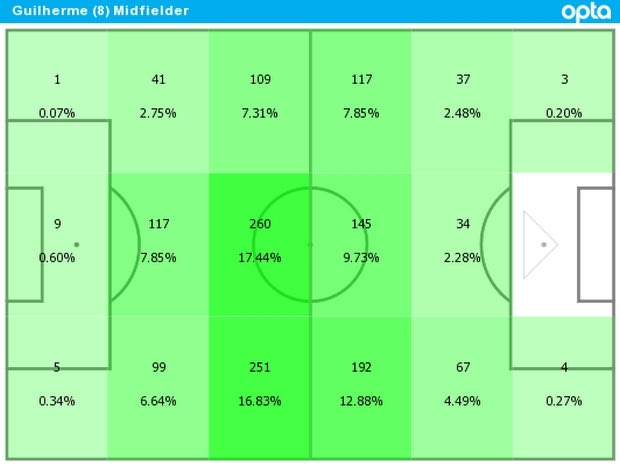 Και αυτός είχε Νο1 αγαπημένο χώρο το κέντρο κάτω από τη σέντρα, αλλά δείτε πόσο εύκολος ήταν να πάει στο πλάι. Ο Γκιλιέρμε είχε 260 πάσες που ξεκίνησαν κεντρικά και 251 από τα δεξιά του γηπέδου.