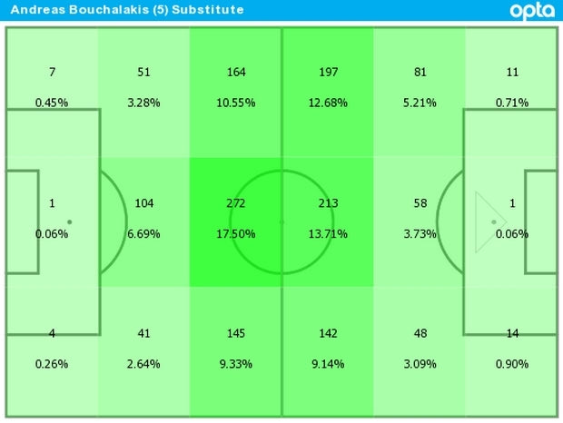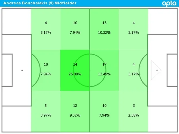 Τα “αγαπημένα” σημεία του Μπουχαλάκη ήταν πέρυσι τα δύο κεντρικά, από όπου συνολικά έκανε το 31% των μεταβιβάσεών του. Τρίτο “αγαπημένο” σημείο, νά’το, αριστερά πάνω από τη σέντρα. Από εκεί έγινε το 13% των πασών του Μπουχαλάκη.
