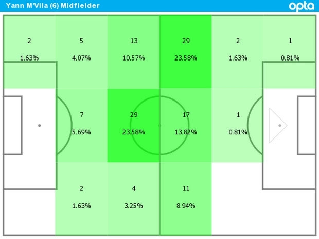 Ξεκινάμε από τον Γάλλο. Στο πρώτο γράφημα θα δείτε τα σημεία από όπου πασάρει ο Εμβιλά μέχρι στιγμής στο πρωτάθλημα. Το γήπεδο είναι χωρισμένο σε κομμάτια και σε κάθε ένα απ’αυτά βλέπετε πόσες πάσες έχει από εκεί, αλλά και από ποια σημεία του γηπέδου πασάρει περισσότερο.