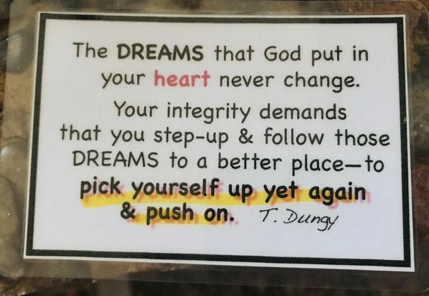 «Τα όνειρα που βάζει ο Θεός στην καρδιά σου δεν αλλάζουν ποτέ. H ακεραιότητα σου απαιτεί να κάνεις βήματα προς τα εμπρός, να ακολουθείς αυτά τα όνειρα, να φτάνεις σε μια καλύτερη θέση, να ξανασηκώνεσαι και να σπρώχνεις τον εαυτό σου».
