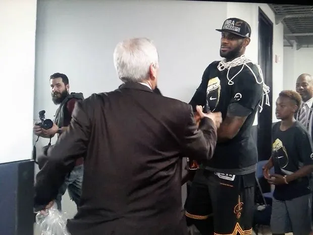 Μισή ώρα μετά τη λήξη του έβδομου τελικού των Καβαλίερς με τους Γουόριορς και ενώ έφευγεμαζί με τον γιόκα του και με τη συνοδεία του από την αίθουσα Τύπου και κατευθυνόταν προς τα αποδυτήρια, με είδε μπροστά του και κοντοστάθηκε.