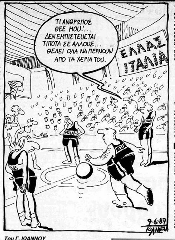 Πολιτικοί, κοινωνιολόγοι, φιλόσοφοι προσπαθούσαν να εξηγήσουν το φαινόμενο. Ήταν πρωτόγνωρο, ήταν κάτι που αδυνατούσαμε να εξηγήσουμε. Όλοι, πλέον, μιλούσαν για μπάσκετ. Ακόμη και πολιτικές γελοιογραφίες, όπως του αξεπέραστου Ιωάννου, είχαν … την πορτοκαλί μπάλα πρωταγωνίστρια