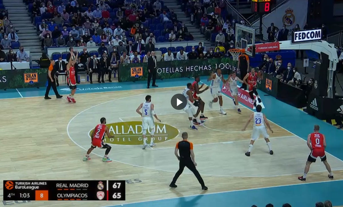 Στο γήπεδο, βέβαια, δεν βρίσκεται μόνο ο Ολυμπιακός. Η άμυνα της Ρεάλ που έχει κλείσει την άμυνά της, πρώτον για να μη δεχθεί σουτ από τον Σλούκα και δεύτερο για να του απαγορεύσει μια άλλη πάσα πλην εκείνης προς τον Γουόκαπ. Ο Γιουλ αφήνει ξεμαρκάριστο τον γκαρντ με το χειρότερο ποσοστό ξέροντας ότι δεν κινδυνεύει άμεσα από εκείνη τη γωνία.