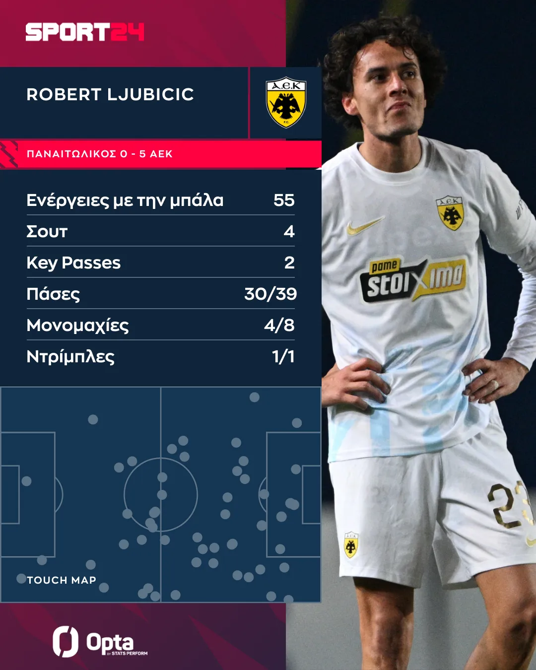Σε γενικές γραμμές θα λέγαμε ότι ήταν ο κλασικός Λιούμπιτσιτς στο κομμάτι των τρεξιμάτων, συνεισφέροντας σε επίθεση και άμυνα, βάζοντας όμως πολύ πιο ουσία στο παιχνίδι του με την ελευθερία των κινήσεων που είχε κόντρα στον Παναιτωλικό.