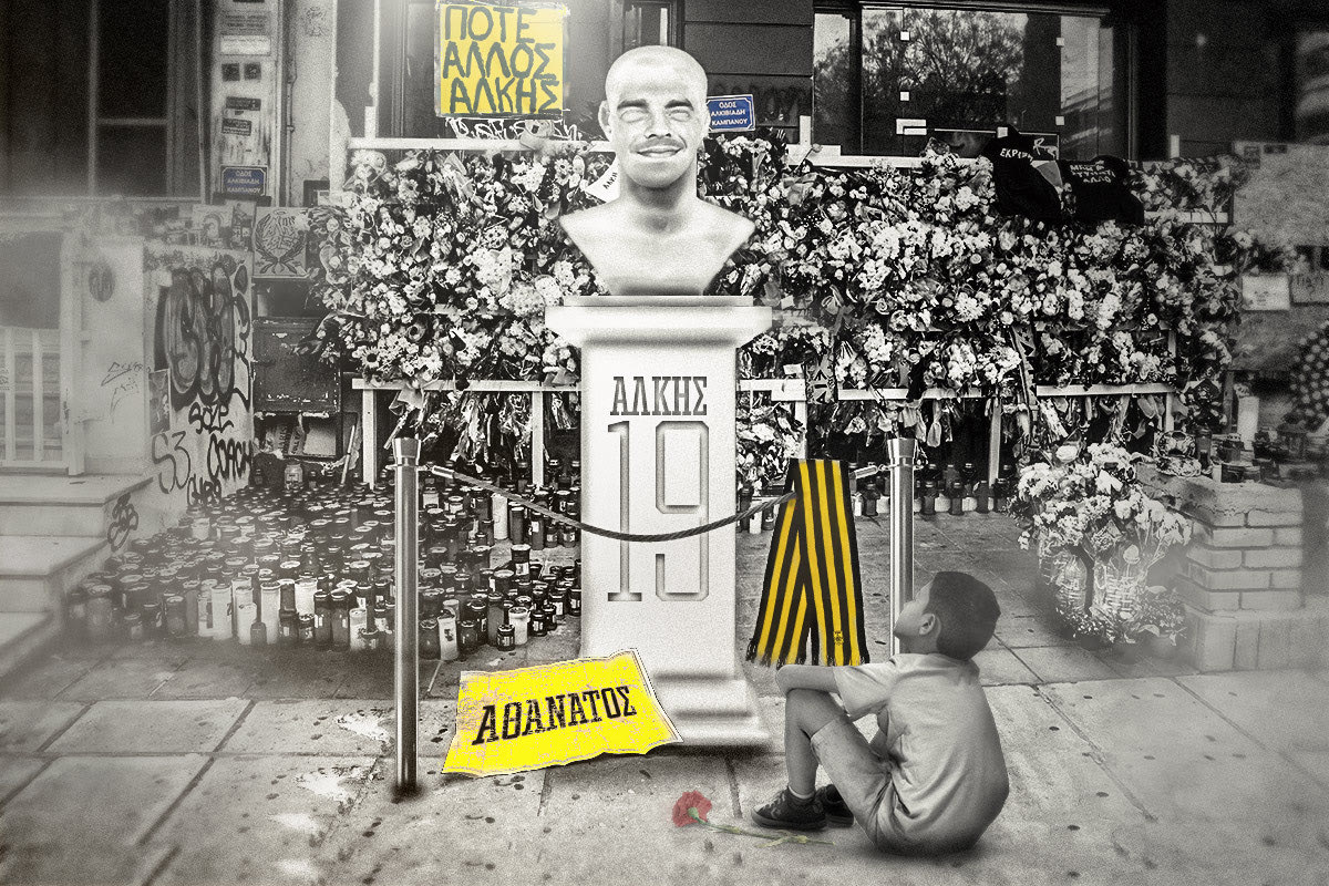 Έβγαλαν τότε τα μαχαίρια, τα ρόπαλα, τα δρεπάνια και λίγα λεπτά αργότερα το όνομα του Αλκη έμελλε να προστεθεί στην εκατόμβη της τυφλής οπαδικής βίας, ενόσω ακουγόταν με όση δύναμη μπορούσε να αντλήσει από μέσα του μια ξέπνοη σπαρακτική ικεσία…