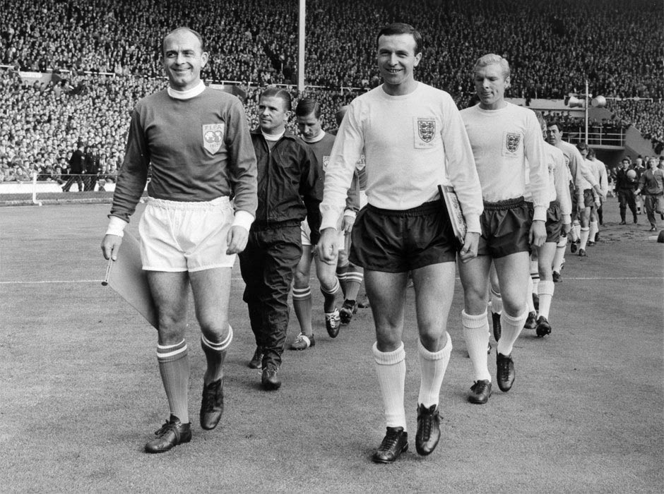Η είσοδος των δυο ομάδων στον αγωνιστικό χώρο. Αριστερά ο αρχηγός της Μικτής Κόσμου, Ντι Στέφανο και πίσω του ο Πούσκας. Δεξιά ο αρχηγός της Αγγλίας, Τζίμι Άρμφιλντ και πίσω του ο Μπόμπι Μουρ.