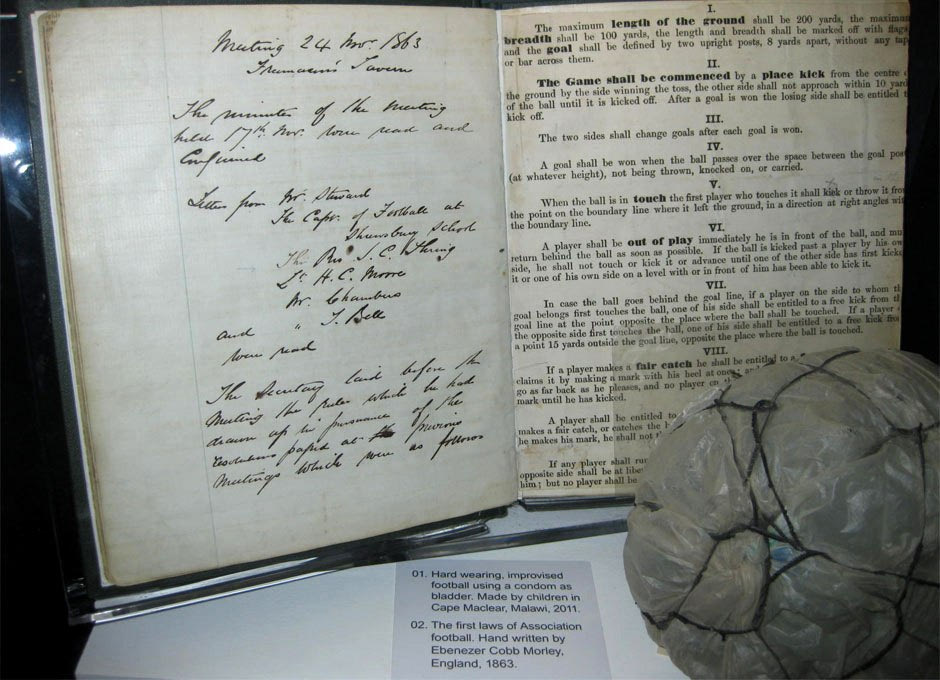 Οι αυθεντικοί χειρόγραφοι κανονισμοί του ποδοσφαίρου από τον Εμπενίζερ Κόμπ Μόρλεϊ, όπως εκτίθενται σήμερα στο Εθνικό Μουσείο Ποδοσφαίρου της Αγγλίας στο Μάντσεστερ.