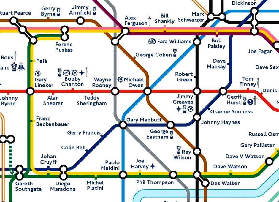 Τμήμα του Μετρό του Λονδίνου με τα ονόματα ποδοσφαιριστών στους σταθμούς του. Διακρίνονται αριστερά οι σταθμοί Μαραντόνα, Πελέ, Κρόιφ, Πούσκας, Μπέκενμπαουερ, Πλατινί, Μαλντίνι κλπ.
