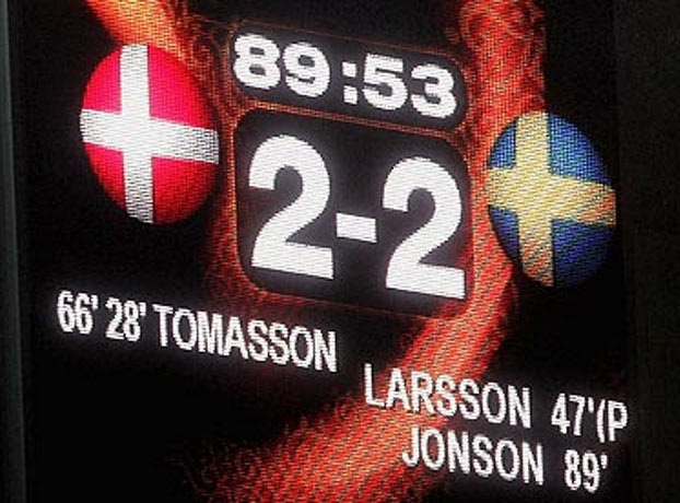 Το φινάλε πλησίαζε, Δανία και Σουηδία έπαιρναν την πρόκριση λόγω της ιταλικής ισοπαλίας, με τις καθυστερήσεις να είναι ένα και πέντε λεπτά αντίστοιχα. Στο 89′, με το 1-1 και στα δύο γήπεδα, ο Κρίστιαν Βίλχελμσον σεντράρει στην αντίπαλη περιοχή και ο τερματοφύλακας Τόμας Σόρενσεν, ο οποίος είχε υποπέσει στο πέναλτι, κάνει άστοχη έξοδο, «σερβίροντας» το γκολ στον Ματίας Γιόνσον, προ κενής εστίας. Το «ασυνήθιστο» 2-2 που έλεγε ο Λάγκερμπακ γίνεται πραγματικότητα και το γκολ του Αντόνιο Κασάνο που έδωσε στην Ιταλία τη νίκη στο τέταρτο λεπτό των καθυστερήσεων, δεν έχει καμία απολύτως αξία.