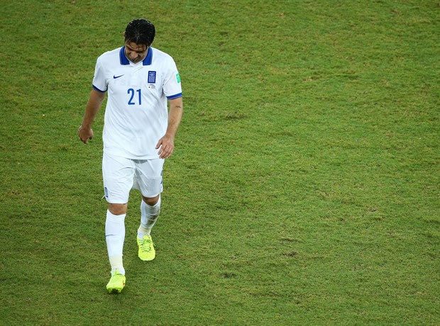 NATAL, BRAZIL - JUNE 19: Konstantinos Katsouranis of Greece is sent off after being given a second yellow and red card during the 2014 FIFA World Cup Brazil Group C match between Japan and Greece at Estadio das Dunas on June 19, 2014 in Natal, Brazil. (Photo by Robert Cianflone/Getty Images)