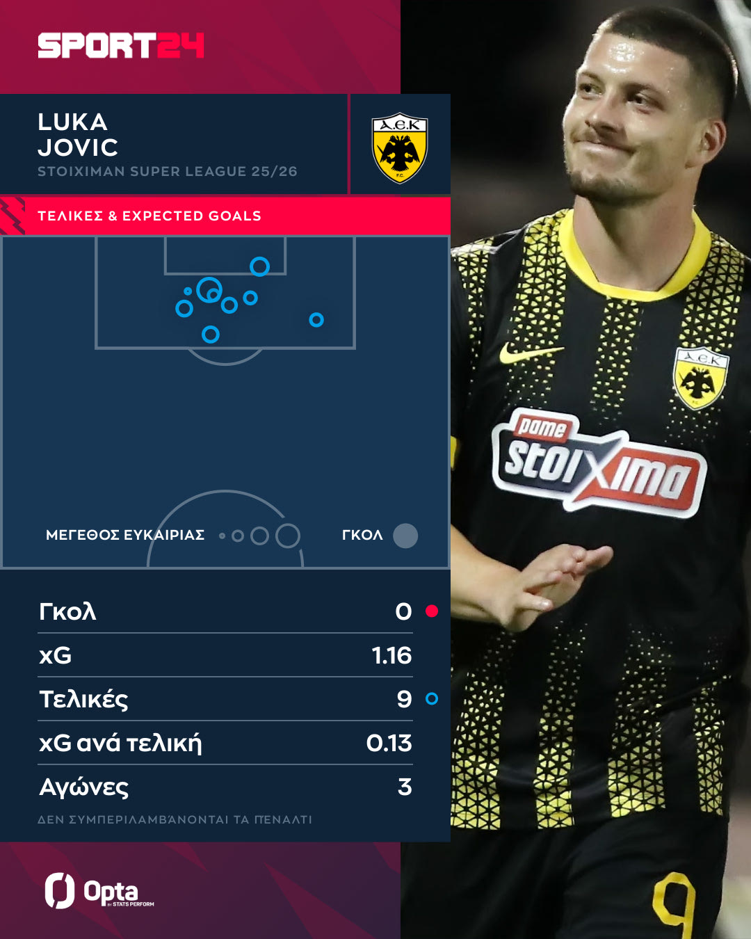 Αρκετή κουβέντα έγινε για τον Λούκα Γιόβιτς και τις ευκαιρίες που του παρουσιάστηκαν στα πόδια του για να τις κάνει γκολ. Όντως ο Σέρβος φορ είχε έξι τελικές που είχαν “αξία” 0.98 xGoals (άρα βάσει ευκαιρία “θα έπρεπε” να έχει σκοράρει.