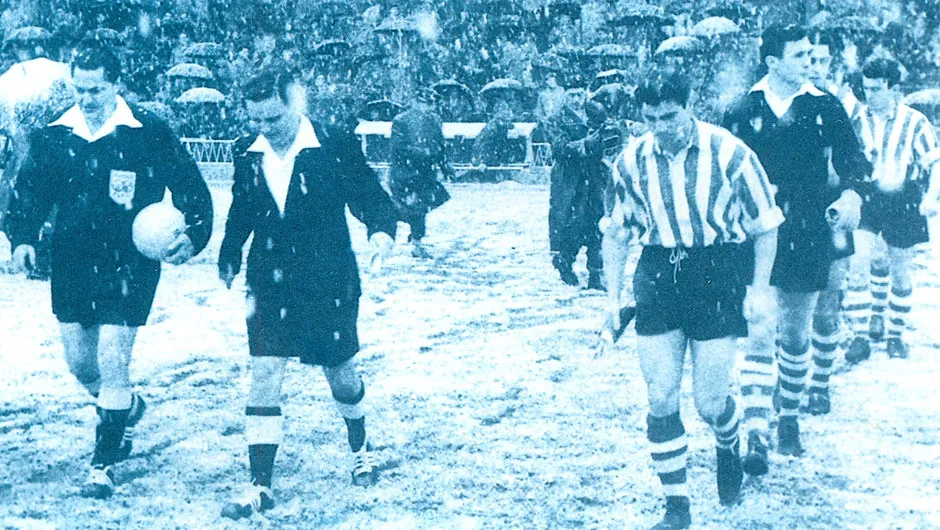 Η ομάδα των “έντεκα χωρικών” κάνει την είσοδό της στο χιονισμένο Σαν Μαμές για να αντιμετωπίσει την Μάντσεστερ Γιουνάιτεντ. Οι Βάσκοι κέρδισαν τους Άγγλους 5-3 σε μια επική συνάντηση (16/1/1957)