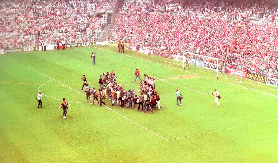 Οι παίκτες της Αθλέτικ έχουν κερδίσει το πρωτάθλημα και ποζάρουν για τις αναμνηστικές φωτογραφίες, ενώ το Σαν Μαμές “φλέγεται” (1983/84)